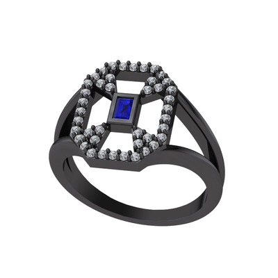 Lab safir ve pırlanta 925 ayar siyah rodyum kaplama gümüş yüzük (0.3696 karat)