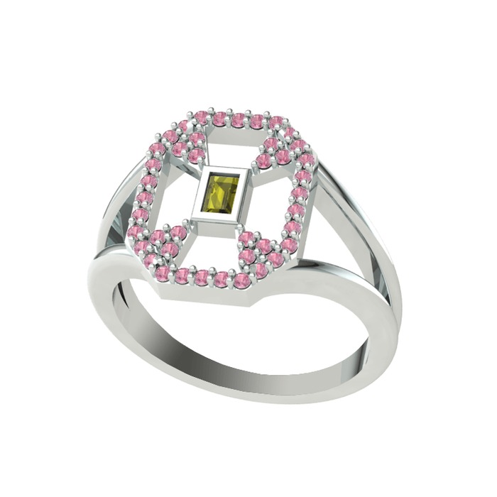 Peridot ve pembe kuvars 14 ayar beyaz altın yüzük