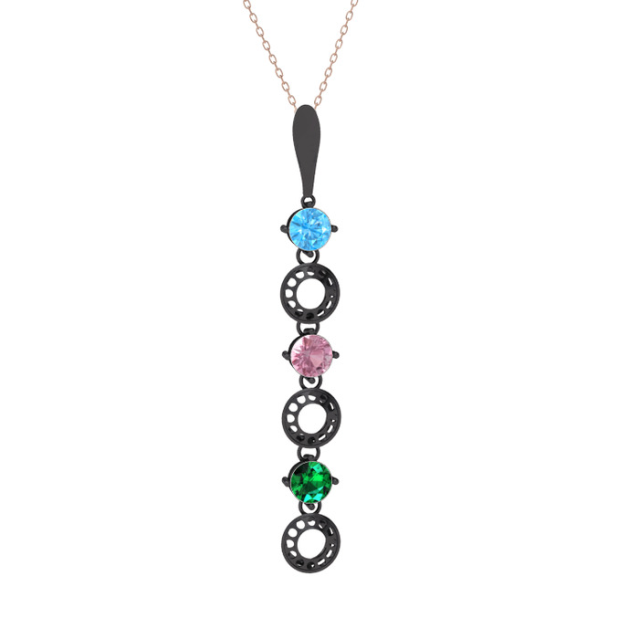 Akuamarin, pembe kuvars ve yeşil kuvars 925 ayar siyah rodyum kaplama gümüş kolye (40 cm rose altın rolo zincir)