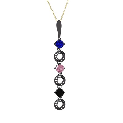Lab safir, pembe kuvars ve siyah zirkon 925 ayar siyah rodyum kaplama gümüş kolye (40 cm gümüş rolo zincir)