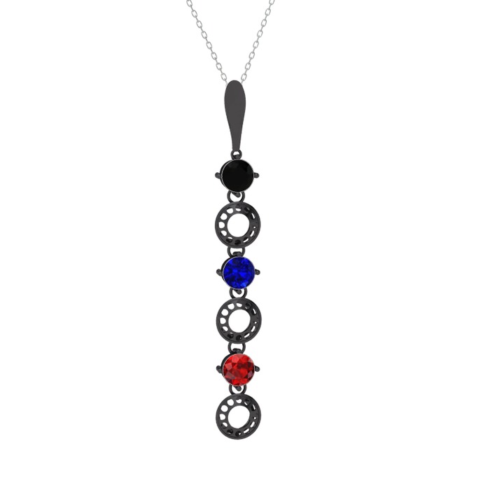 Siyah zirkon, lab safir ve garnet 925 ayar siyah rodyum kaplama gümüş kolye (40 cm beyaz altın rolo zincir)