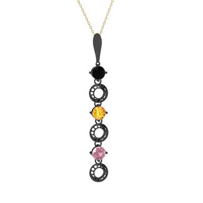 Siyah zirkon, sitrin ve pembe kuvars 925 ayar siyah rodyum kaplama gümüş kolye (40 cm altın rolo zincir)