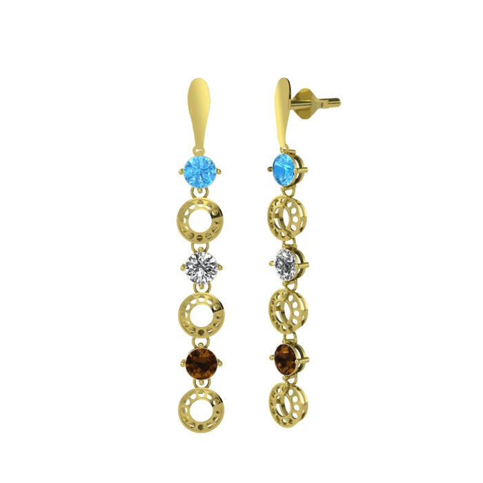 Akuamarin, beyaz zirkon ve dumanlı kuvars 18 ayar altın küpe