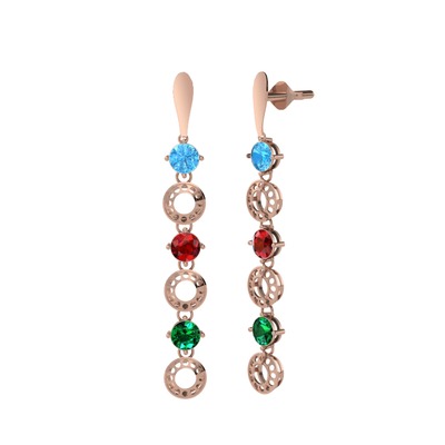 Akuamarin, garnet ve yeşil kuvars 14 ayar rose altın küpe