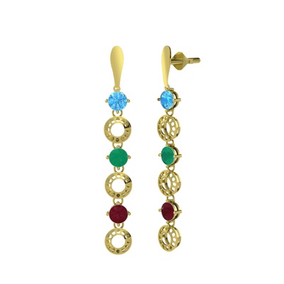 Akuamarin, kök zümrüt ve kök yakut 18 ayar altın küpe