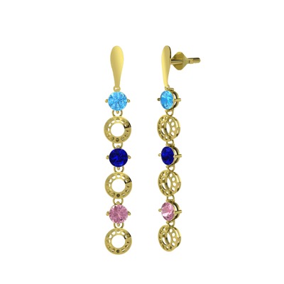 Akuamarin, lab safir ve pembe kuvars 14 ayar altın küpe