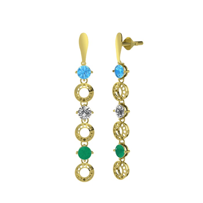 Akuamarin, swarovski ve kök zümrüt 14 ayar altın küpe