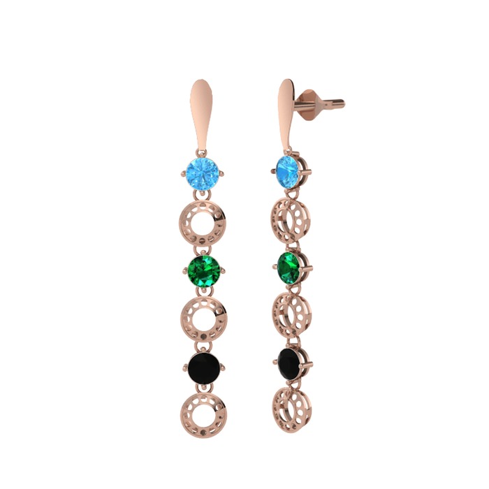 Akuamarin, yeşil kuvars ve siyah zirkon 925 ayar rose altın kaplama gümüş küpe