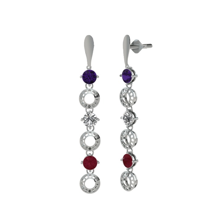 Ametist, beyaz zirkon ve kök yakut 8 ayar beyaz altın küpe