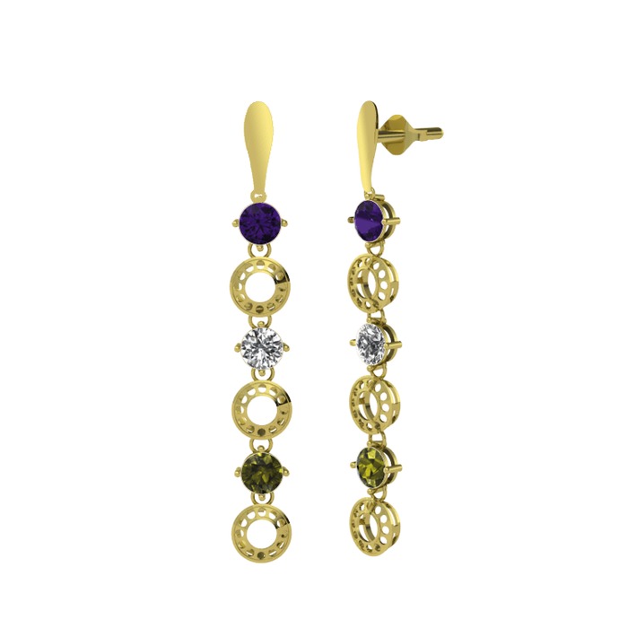 Ametist, beyaz zirkon ve peridot 8 ayar altın küpe