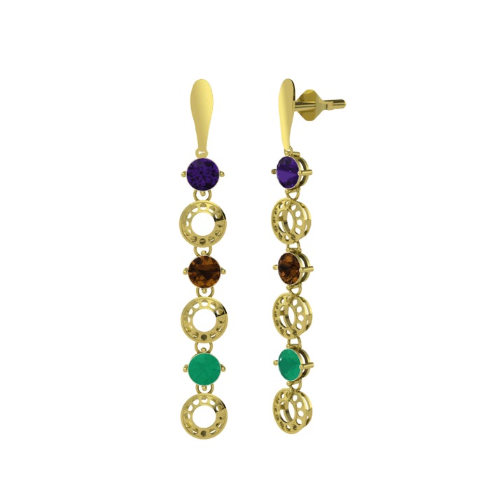 Ametist, dumanlı kuvars ve kök zümrüt 14 ayar altın küpe