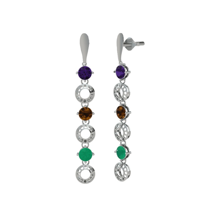 Ametist, dumanlı kuvars ve kök zümrüt 925 ayar gümüş küpe