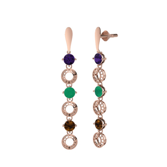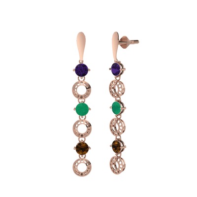 Ametist, kök zümrüt ve dumanlı kuvars 925 ayar rose altın kaplama gümüş küpe
