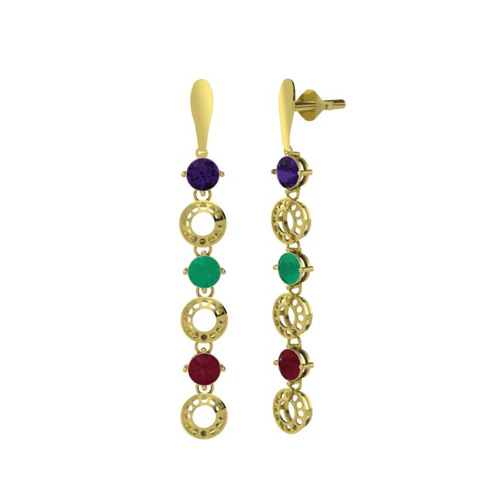 Ametist, kök zümrüt ve kök yakut 18 ayar altın küpe