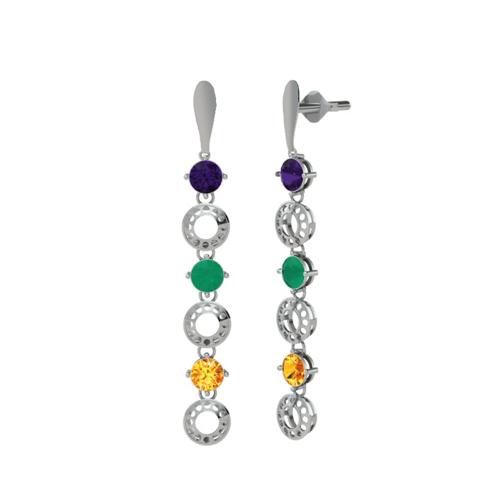 Ametist, kök zümrüt ve sitrin 14 ayar beyaz altın küpe