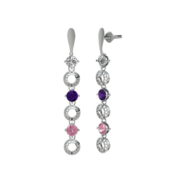 Beyaz zirkon, ametist ve pembe kuvars 925 ayar gümüş küpe