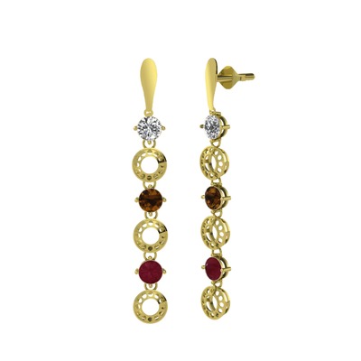 Beyaz zirkon, dumanlı kuvars ve kök yakut 18 ayar altın küpe