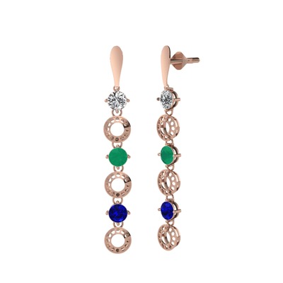 Beyaz zirkon, kök zümrüt ve lab safir 14 ayar rose altın küpe
