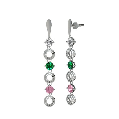 Beyaz zirkon, yeşil kuvars ve pembe kuvars 14 ayar beyaz altın küpe