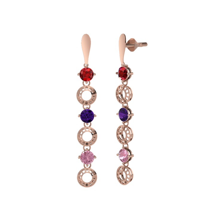 Garnet, ametist ve pembe kuvars 8 ayar rose altın küpe