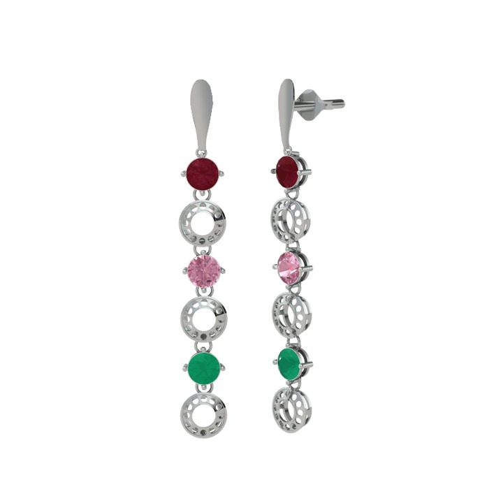 Kök yakut, pembe kuvars ve kök zümrüt 18 ayar beyaz altın küpe
