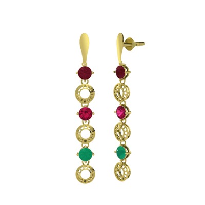 Kök yakut, rodolit garnet ve kök zümrüt 14 ayar altın küpe