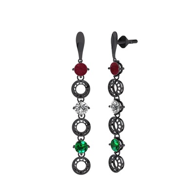 Kök yakut, swarovski ve yeşil kuvars 925 ayar siyah rodyum kaplama gümüş küpe