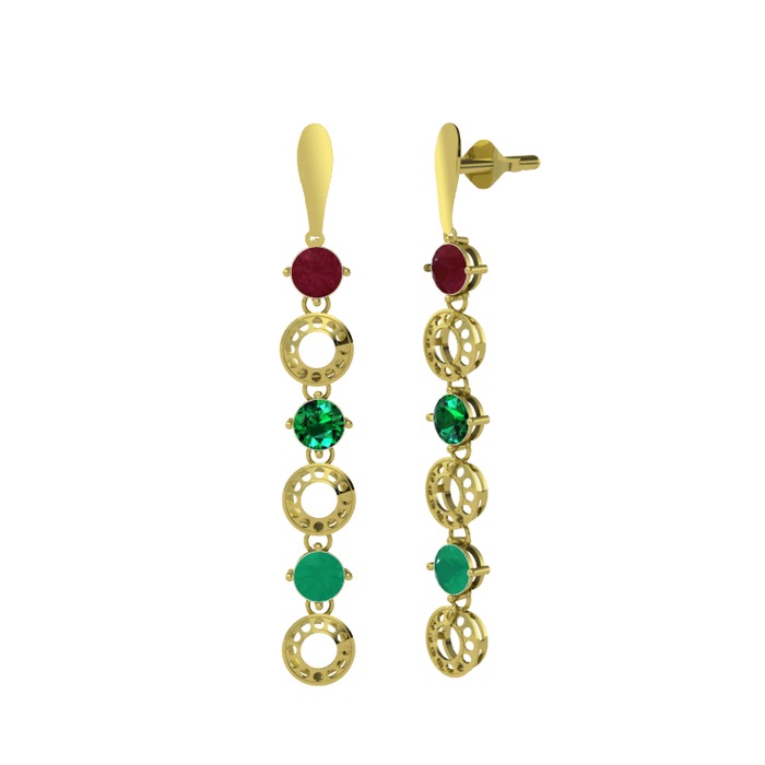 Kök yakut, yeşil kuvars ve kök zümrüt 14 ayar altın küpe