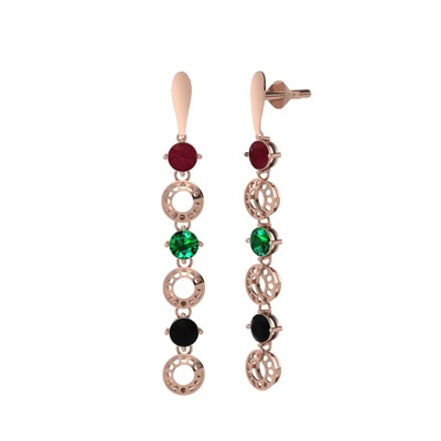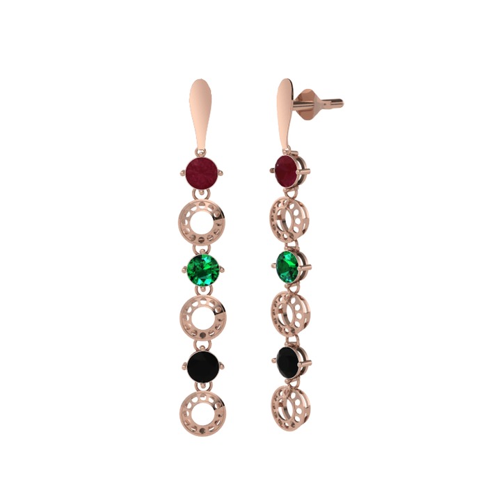 Kök yakut, yeşil kuvars ve siyah zirkon 14 ayar rose altın küpe