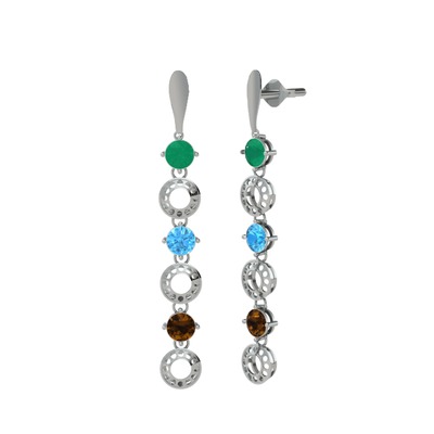 Kök zümrüt, akuamarin ve dumanlı kuvars 14 ayar beyaz altın küpe
