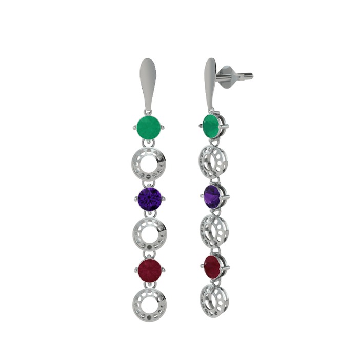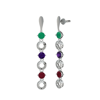 Kök zümrüt, ametist ve kök yakut 8 ayar beyaz altın küpe