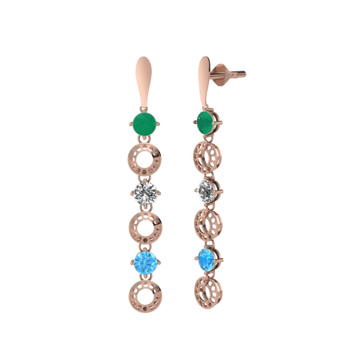 Kök zümrüt, beyaz zirkon ve akuamarin 14 ayar rose altın küpe