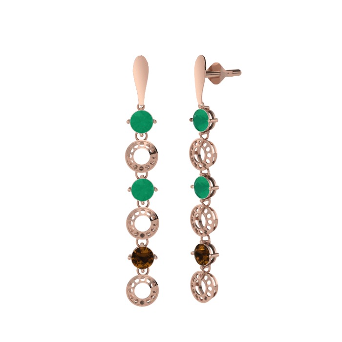Kök zümrüt ve dumanlı kuvars 18 ayar rose altın küpe