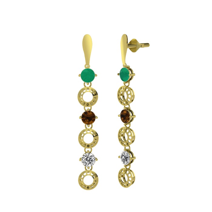Kök zümrüt, dumanlı kuvars ve beyaz zirkon 8 ayar altın küpe