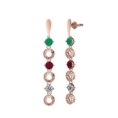 Kök zümrüt, kök yakut ve beyaz zirkon 14 ayar rose altın küpe