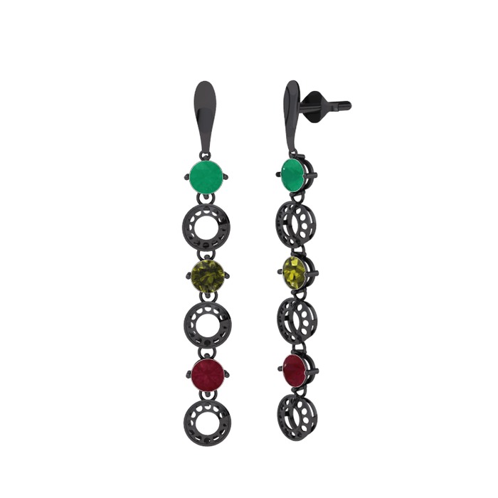 Kök zümrüt, peridot ve kök yakut 925 ayar siyah rodyum kaplama gümüş küpe