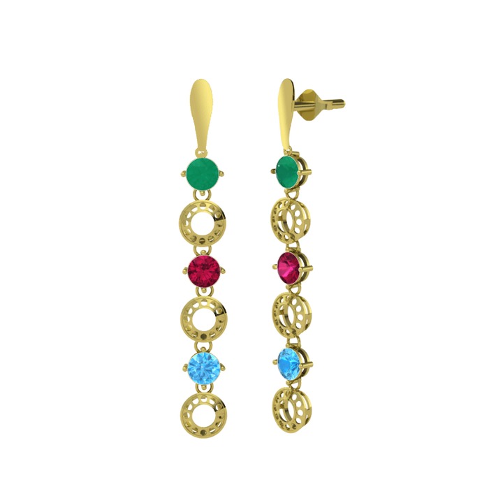 Kök zümrüt, rodolit garnet ve akuamarin 14 ayar altın küpe