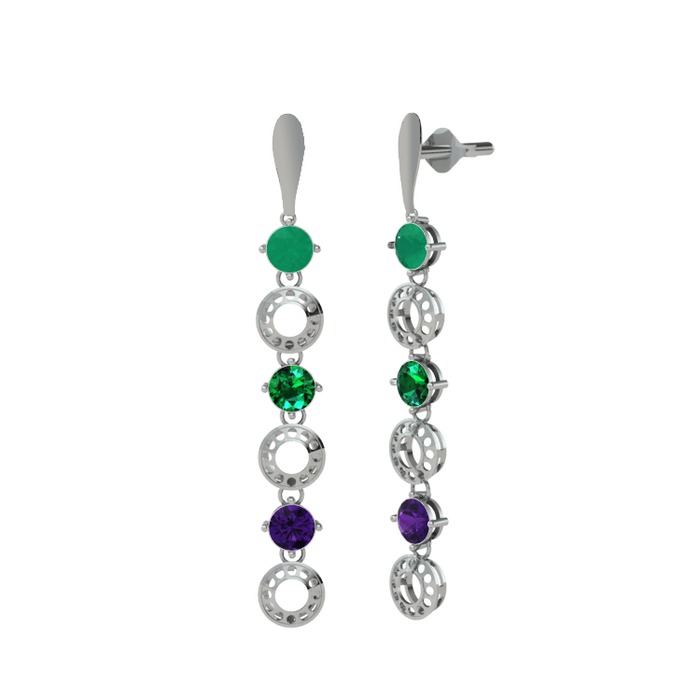 Kök zümrüt, yeşil kuvars ve ametist 14 ayar beyaz altın küpe