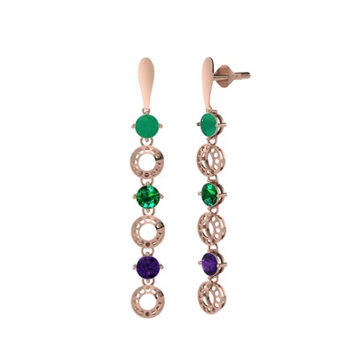 Kök zümrüt, yeşil kuvars ve ametist 925 ayar rose altın kaplama gümüş küpe