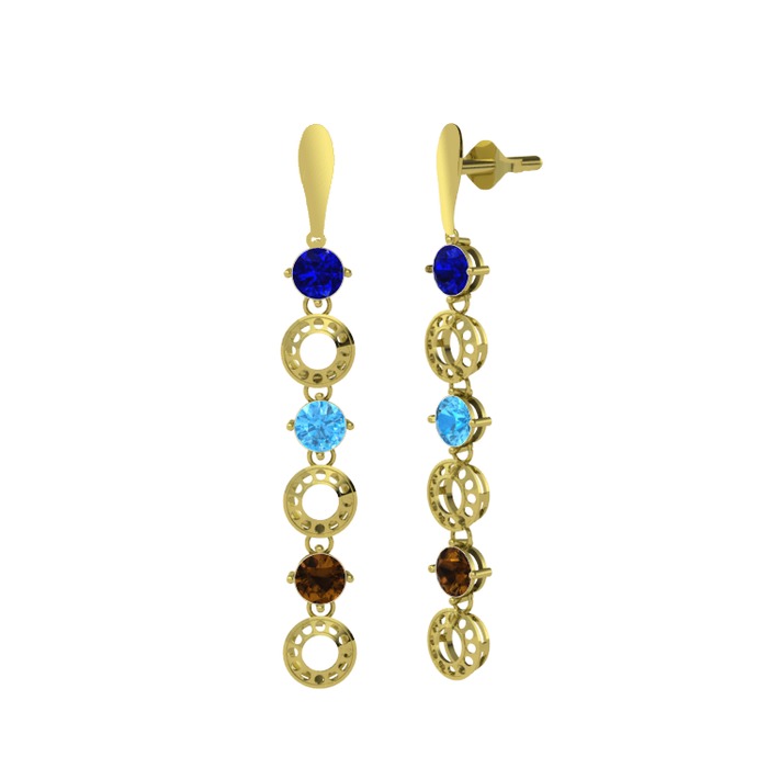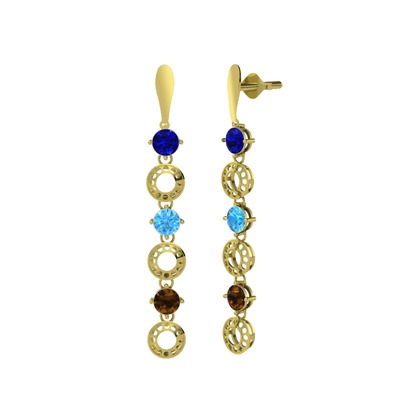 Lab safir, akuamarin ve dumanlı kuvars 18 ayar altın küpe