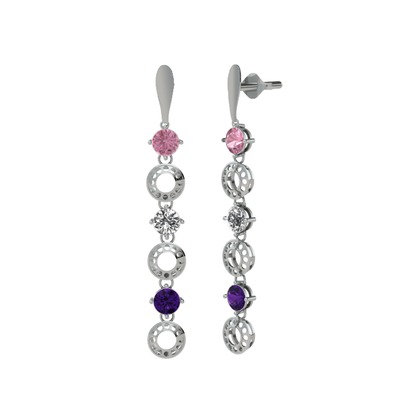Pembe kuvars, beyaz zirkon ve ametist 18 ayar beyaz altın küpe