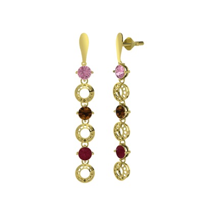 Pembe kuvars, dumanlı kuvars ve kök yakut 18 ayar altın küpe