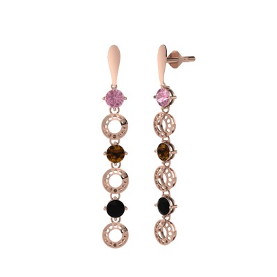 Pembe kuvars, dumanlı kuvars ve siyah zirkon 8 ayar rose altın küpe