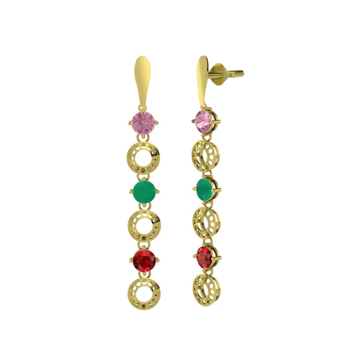 Pembe kuvars, kök zümrüt ve garnet 925 ayar altın kaplama gümüş küpe