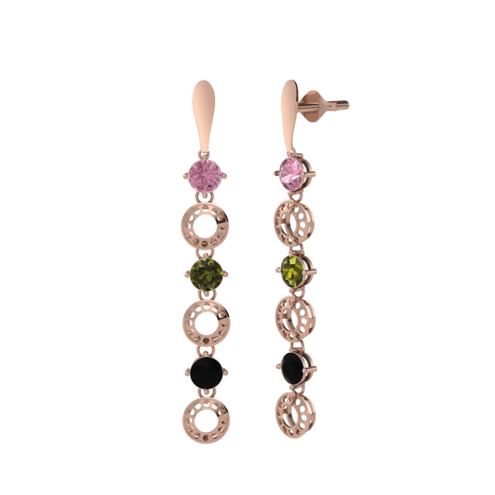 Pembe kuvars, peridot ve siyah zirkon 18 ayar rose altın küpe