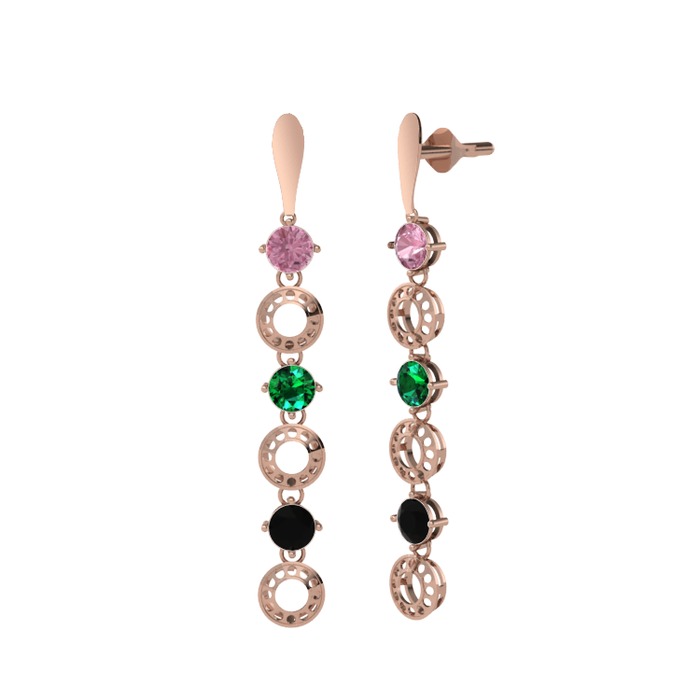 Pembe kuvars, yeşil kuvars ve siyah zirkon 925 ayar rose altın kaplama gümüş küpe
