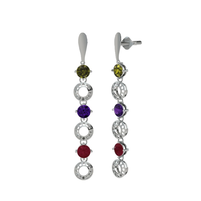 Peridot, ametist ve kök yakut 8 ayar beyaz altın küpe