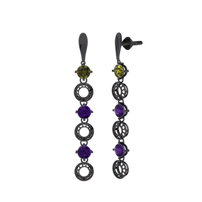 Peridot ve ametist 925 ayar siyah rodyum kaplama gümüş küpe