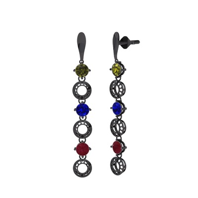 Peridot, lab safir ve kök yakut 925 ayar siyah rodyum kaplama gümüş küpe