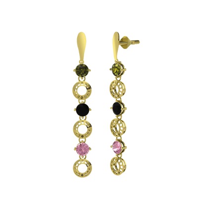 Peridot, siyah zirkon ve pembe kuvars 18 ayar altın küpe
